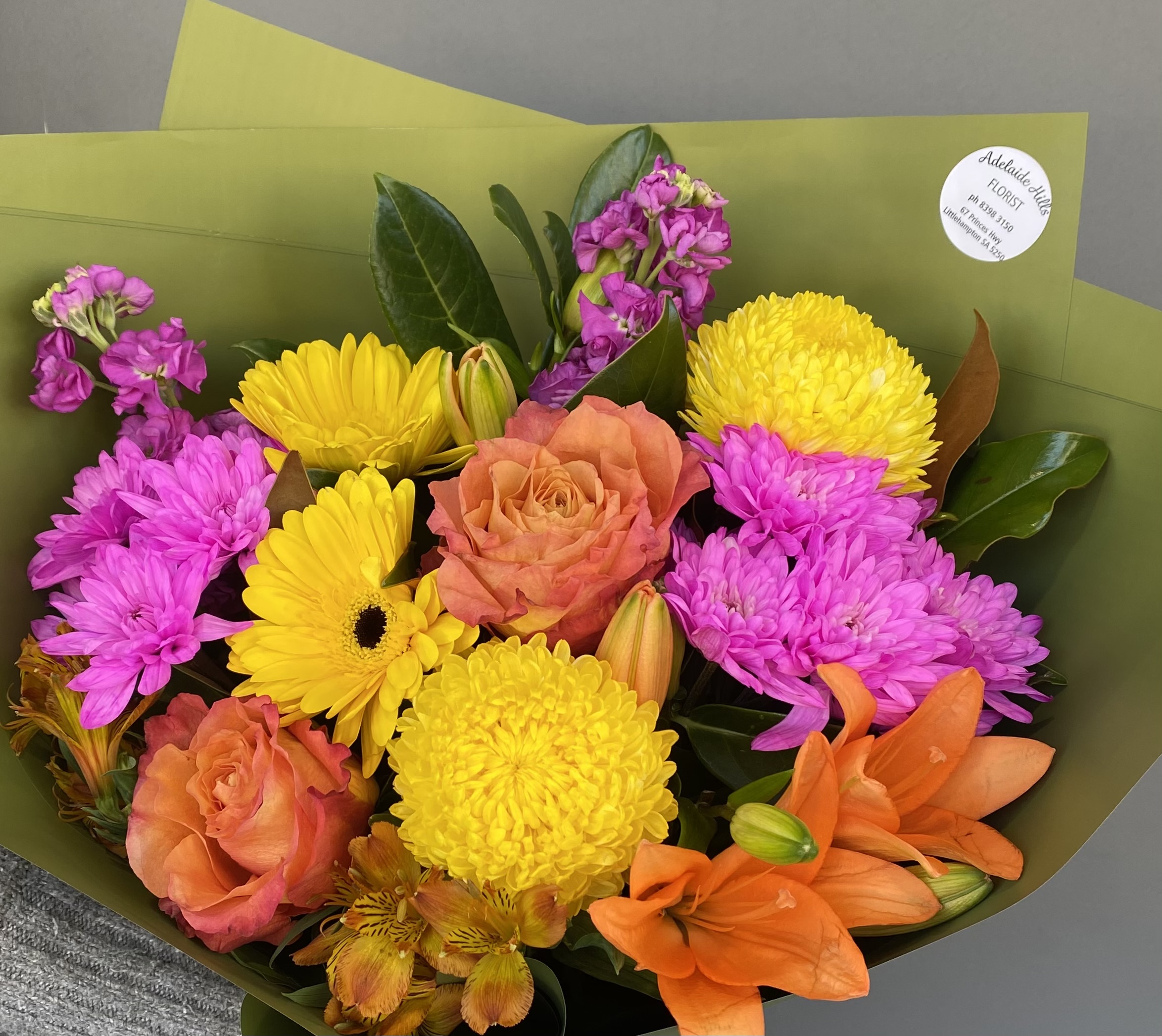 Beautiful bright medium size bouquet featuring roses just in time to celebrate your Mum.